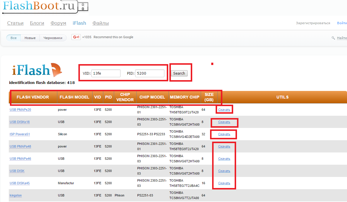 Следующий шаг – поиск подходящей программы для прошивки контроллера. Поиск осуществляется на сайте flashboot.ru в разделе iFlash. Вам нужно ввести значение VID и PID (четырехзначные числа после знака нижнего подчеркивания) и нажать кнопку «Найти».