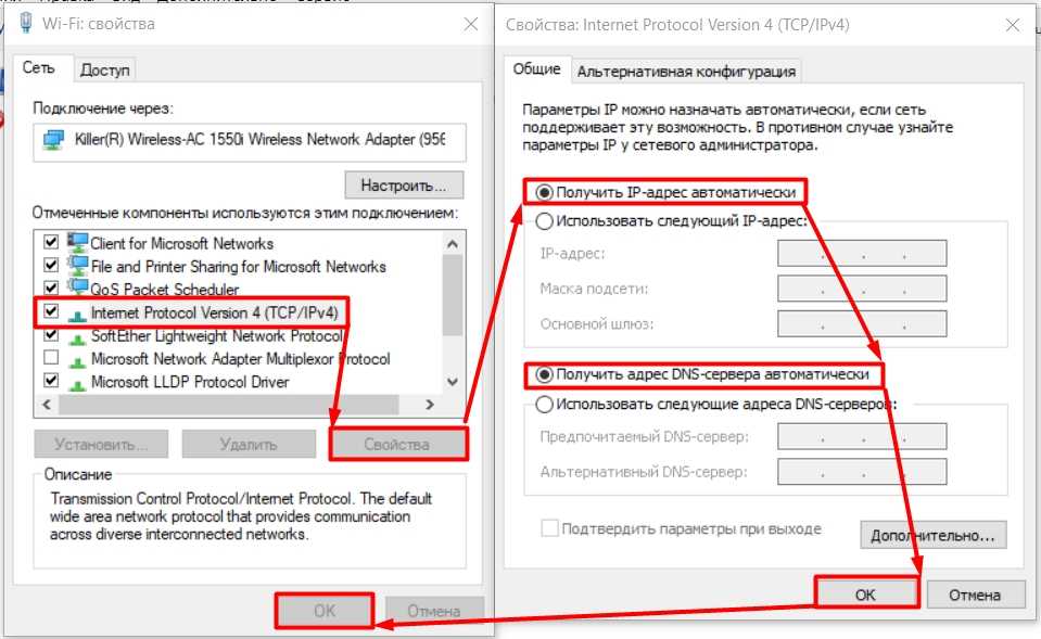 Один раз нажмите на строчку протокола (TCP/IPv4), после этого переходим опять в «Свойства». Установите автоматическое получение IP и DNS, так как это показано на картинке ниже. И два раза нажмите на кнопку «ОК».