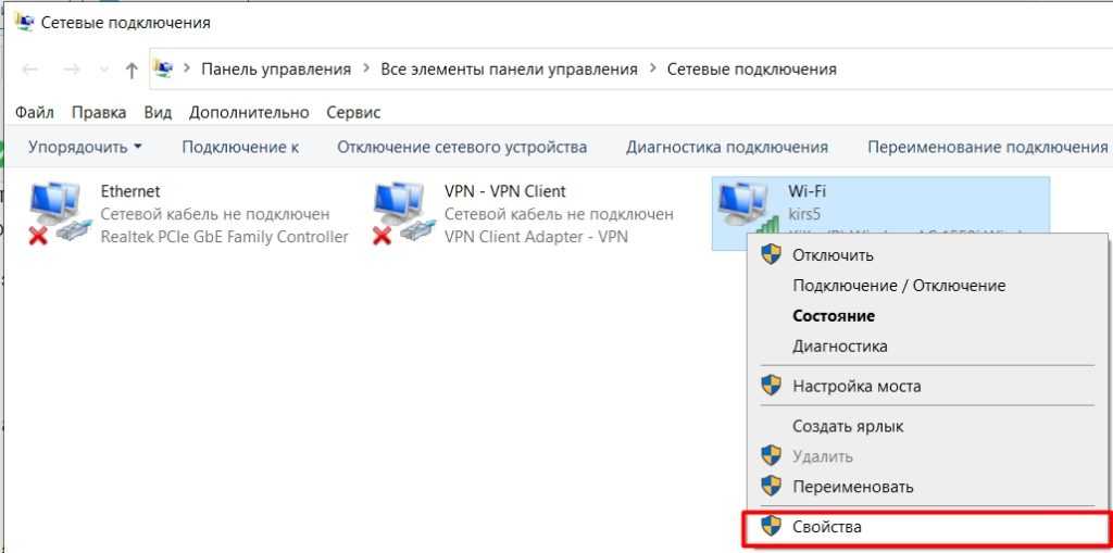 - Далее вы должны увидеть те физические подключения, которые у вас есть. Их должно быть две штуки: «Ethernet» – подключение по проводу, «Wi-Fi» – беспроводное подключение. Нажмите правой кнопкой мыши по тому подключению, которое вы используете для коннекта с роутером. После этого заходим в «Свойства».