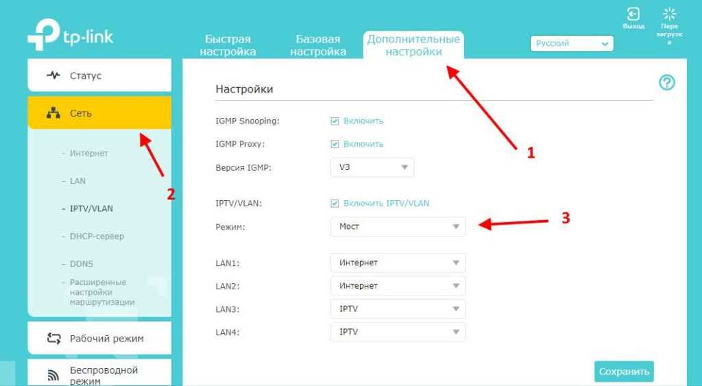 На разных маршрутизаторах пункты меню могут называться по-разному, например, на скриншотах показан старый интерфейс роутеров Tp-Link. Однако суть настройки не меняется: вам нужно найти пункт «IPTV» и установить параметры как на фото.