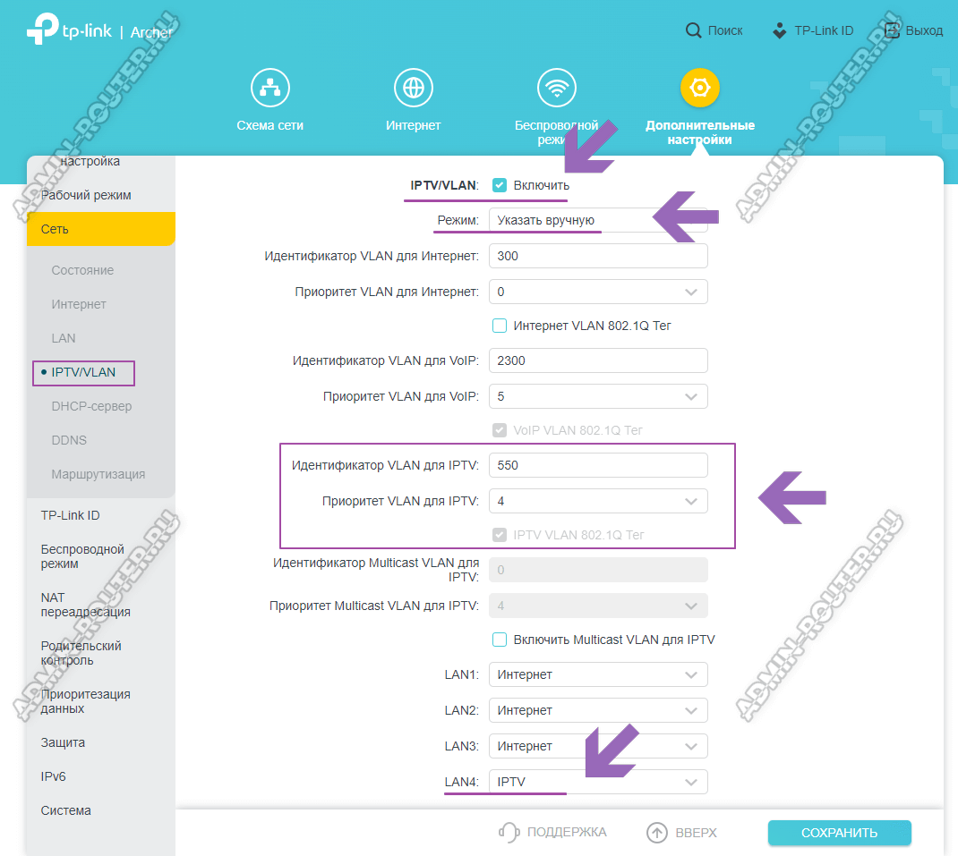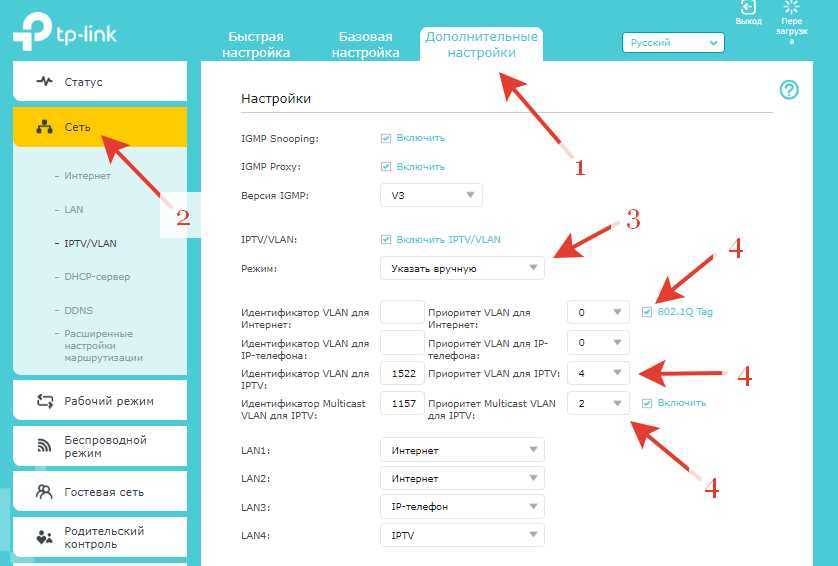 Дальше надо прописать номер VLAN в соответствующее поле. Так же надо поставить приоритет для трансляции равным «4». Внизу так же надо выбрать один из LAN-портов для подключения ТВ-приставки. После этого сохраняем настройки и проверяем работу ТВ.