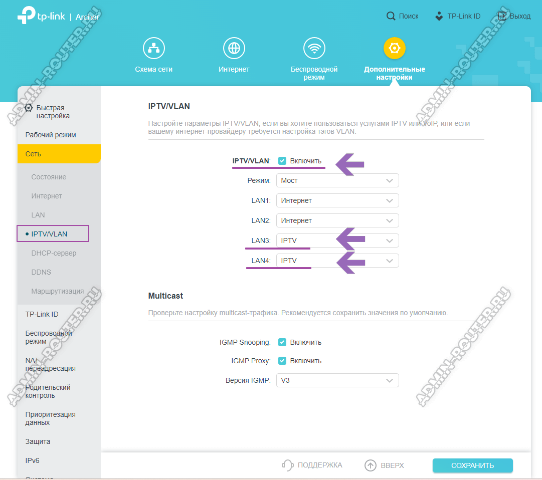 Вам нужно найти раздел с настройками IPTV, включить функцию и выбрать вариант «Мост»(Bridge). Так же надо будет выбрать порт на роутере, в который будет включена ТВ-приставка — им может быть любой порт: LAN1-LAN4.