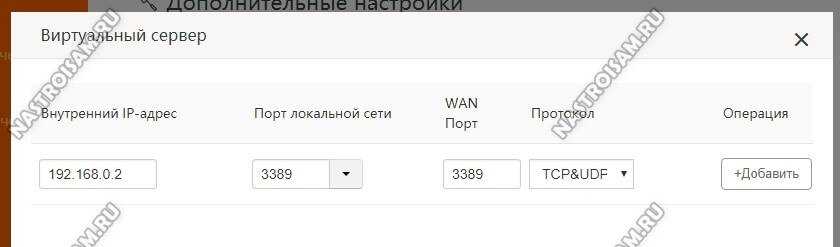Тут Вам нужно прописать IP-адрес, для которого надо открыть порт на Тенде и указать номер этого порта для локальной сети и для WAN. Остаётся только указать используемый протокол (оптимальнее выбирать значение TCP&UDP) и нажать на кнопку «Добавить», чтобы правило добавилось в список.