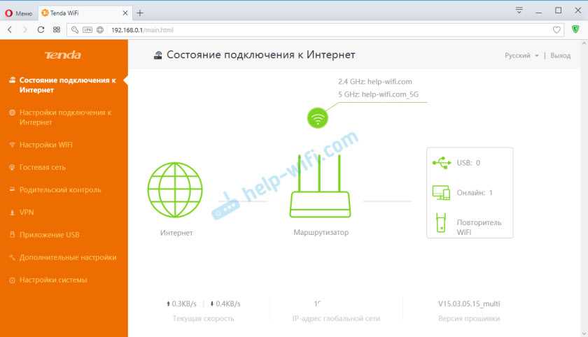 IP-адрес роутера Tenda любой модели (N3, W316R, W368R и т.д.) в локальной сети — 192.168.0.1, логин на доступ — admin, стандартный пароль — admin. Стартовая страница веб-интерфейса выглядит так: