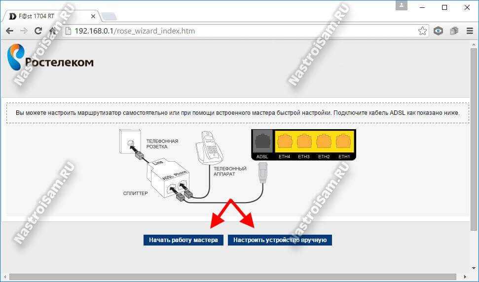 - Далее вам покажут схему подключения к телефонному кабелю – вы еще раз можете проверить, правильно ли вы подключились. Далее есть два варианта: ручная настройка или через мастера. Я предлагаю выбрать вариант «Начать работу мастера».