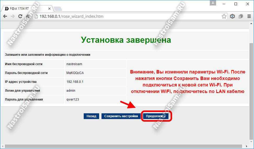 И последним этапом настройки роутера Fast 1744 V2 будет настройка беспроводной сети: мастер предложит включить сеть Wi-Fi, назначить имя и ключ безопасности. После нажатия кнопки «Продолжить» появится заключительный экран, позволяющий проверить правильность ранее введенных данных и сохранить настройку.