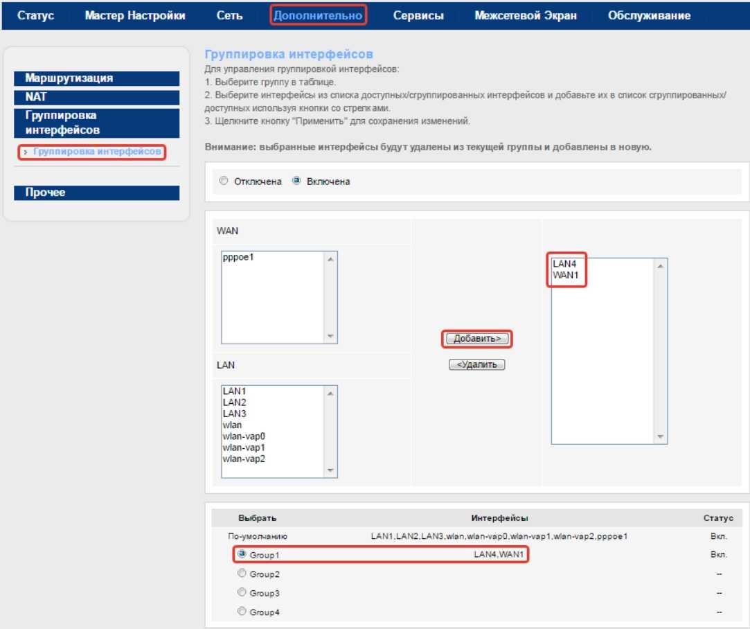 Для корректной работы услуги ТВ необходимо настроить группировку интерфейсов. Открываем в меню Дополнительно раздел Группировка интерфейсов. Активируем опцию “Включена”. Выбираем Group1 и перемещаем необходимые интерфейсы: WAN и LAN порт(ы) к которым будет подключаться ТВ-приставка(и) в правую таблицу.