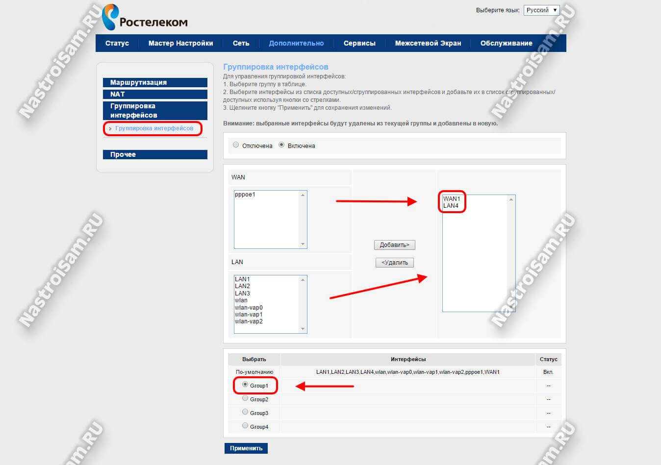 Для IP-TV нужно будет еще указать номер порта и связать его с WAN. Для этого переходим в «Дополнительно» – «Группировка интерфейсов» – теперь из первых двух колонок выбираем «LAN4» и «WAN» и с помощью кнопки «Добавить» переносим два этих порта в правую колонку и нажимаем на кнопку «Применить» в самом низу.