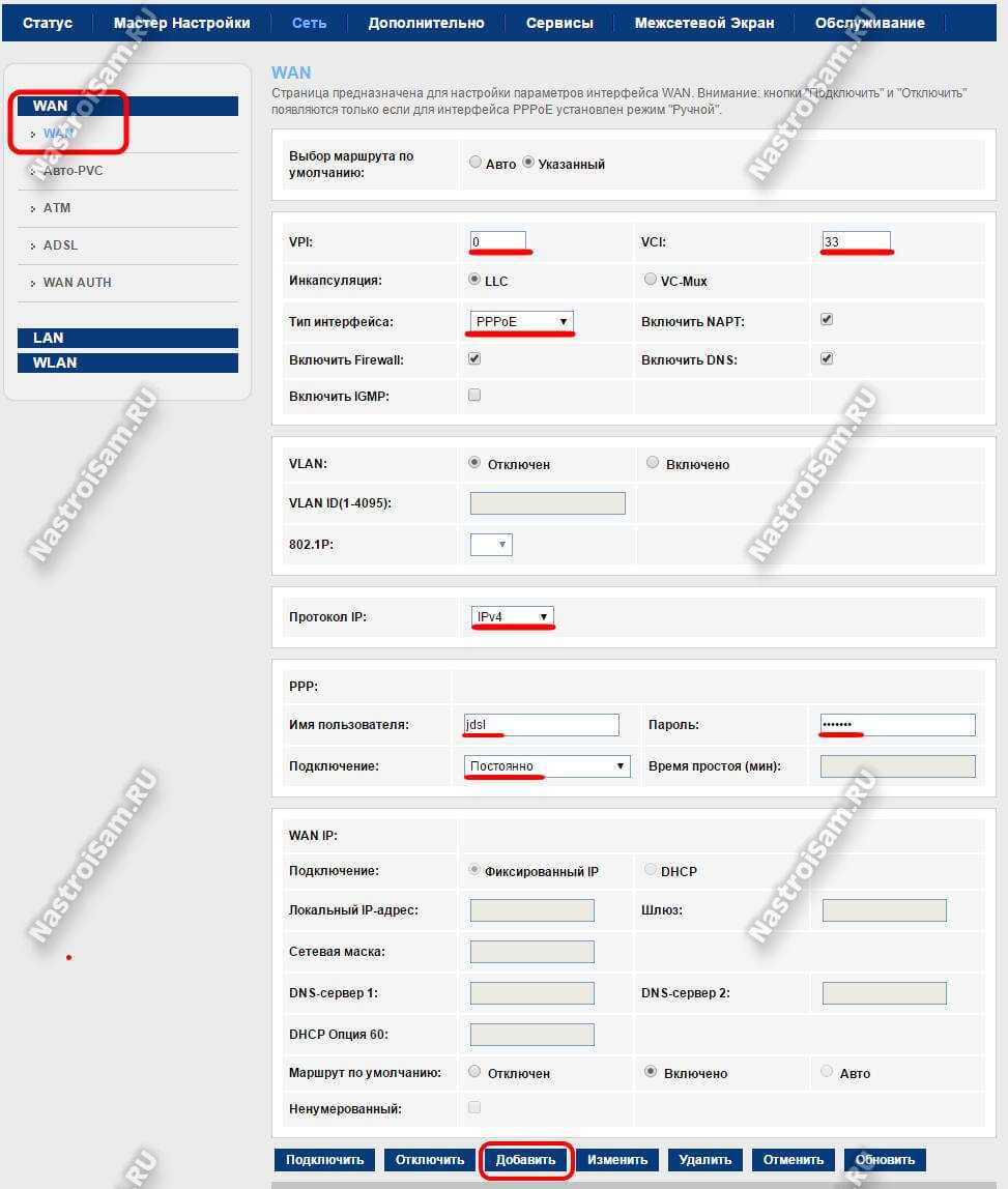 Если у вас возникли какие-то сложности в мастере, например, вы не нашли нужного региона, или после этого не появился интернет, то можно выполнить ручную настройку. Переходим в «Сеть» – «WAN» – вписываем значения VPI и VCI из договора. Выключаем IGMP. Обязательно проверьте, чтобы стоял «Протокол IP» – «IPv4». Ниже указываем логин и пароль, также из договора. В самом низу нажимаем «Добавить».