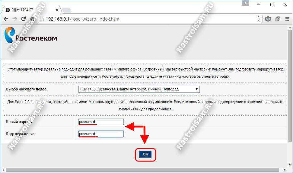 Если этого не произошло, попробуйте ввести в адресную строку ip модема — 192.168.0.1. Логин — admin, пароль по умолчанию — admin. При первом входе в конфигурацию модема Ростелеком, он попросит Вас указать пароль администратора.