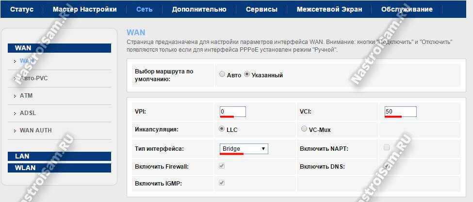 Если у Вас дополнительно подключена услуга IPTV, то для её настройки в большинстве филиалов Ростелекома надо в разделе «Сеть»->»WAN» создать ещё одно соединение типа «Bridge». Параметры VPI/VCI надо будет так же уточнить в техподдержке.