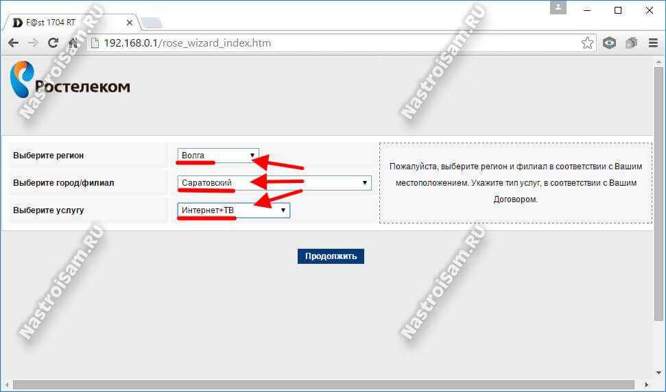 На первом шаге модем Ростелеком попросит Вас указать свой регион, филиал, а так же выбрать услугу, которую хотите настроить: