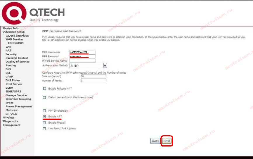 В поля «PPP Username» и «PPP Password» нужно ввести логин и пароль на доступ с карточки, которую Вам выдали при подключении. Далее, ничего не меняем — только проверяем чтобы стояла галочка «Enable NAT».