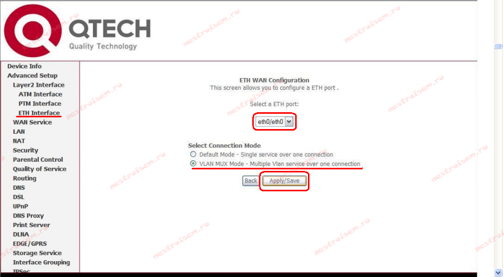 В выпадающем списке «Select a ETH port» Вам нужно выбрать LAN-порт, который мы займем под WAN порт для подключения кабеля провайдера. Я, как правило, занимаю для этих целей 1-й порт — eth0. Ставим галку на «VLAN MUX Mode» и нажимаем кнопку «Apply/Save».