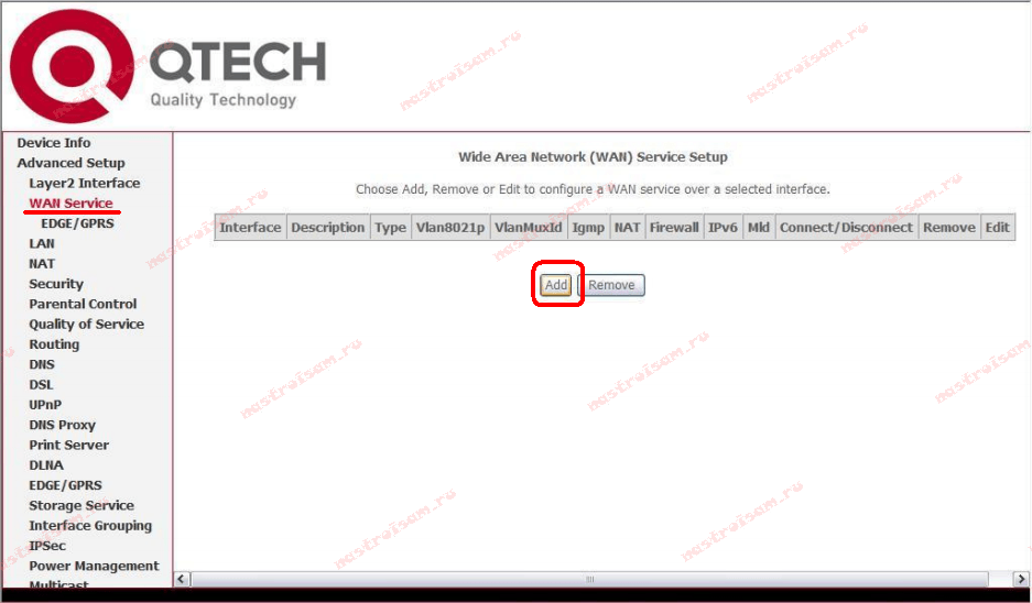 Интерфейс второго уровня создан — теперь нужно создать подключение к Интернет: переходим в раздел «WAN Service»: