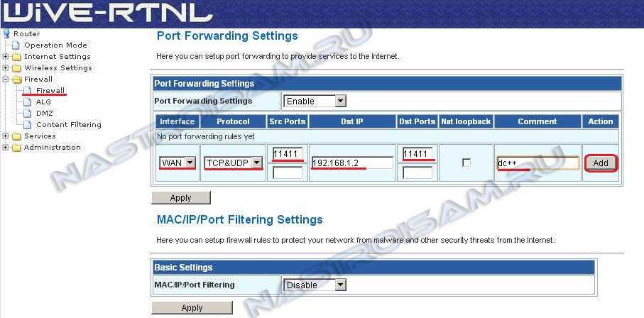 Чтобы настроить проброс портов — port forwarding — на WIVE-NG-RTNL нужно перейти в раздел «Firewall» > «Firewall»: