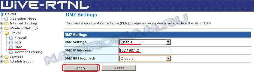 Чтобы настроить демилитаризованную зону — DMZ — на WIVE-NG-RTNL нужно перейти в раздел «Firewall» > «DMZ»: