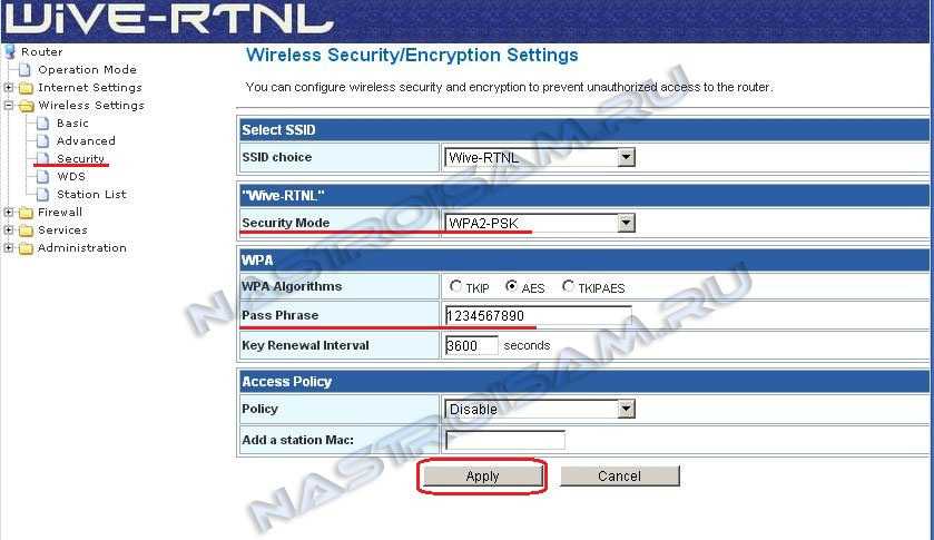 В списке «Security Mode» выбираем «WPA2-PSK, WPA Algorithms» ставим «AES», «Pass Phrase» — ключ сети — любая буквенная, цифирная или смешанная последовательность символов не менее 8 знаков. Нажимаем «Apply».