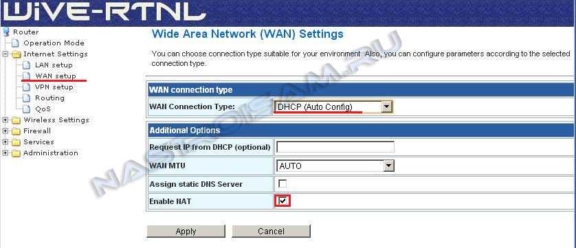 В большинстве случаев параметр «WAN Connection type» стоит оставить по-умолчанию — «DHCP (Auto Config)» — этот значение подходит не только в том случае, если у Вас для подключения к Провайдеру используется DHCP, но и в случает PPPoE и VPN (PPTP, L2TP). Проверяем чтобы стояла галочка «Enable NAT». Нажимаем «Apply».