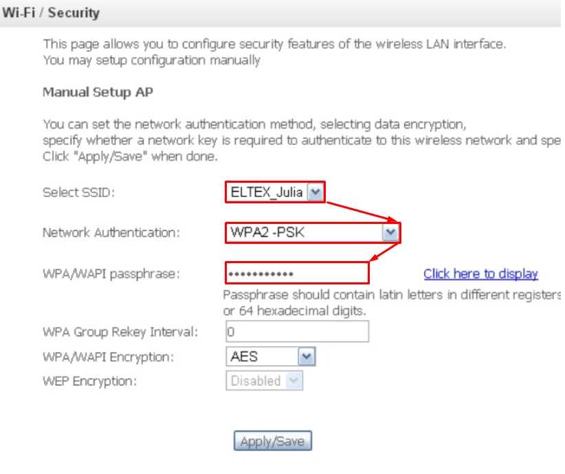 В настройках безопасности роутера надо выбрать тип сертификата безопасности. На текущий момент самый надежный в плане взлома — это WPA2-PSK. Затем надо в поле Network Key или PSK Password прописать ключ безопасности сети. Им может быть буквенная, цифирная или смешанная последовательность не короче 8 символов. Для сохранения параметров нужно нажать кнопку Применить (Apply) или Сохранить (Save).