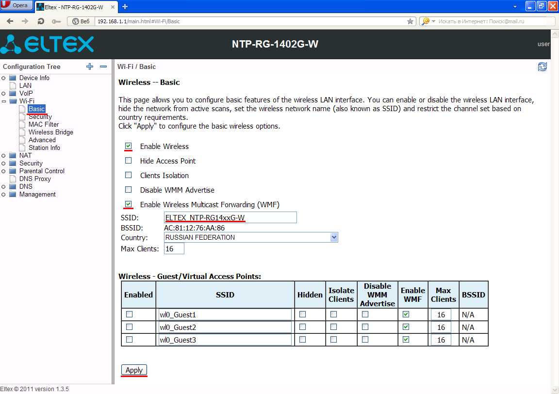 - EnableWireless – включает или выключает вай-фай сеть. Мы её сразу включаем. Но если вам не нужна беспроводная сеть, то деактивируем опцию.