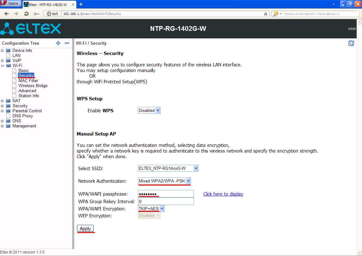 Вообще, по умолчанию, работа сети Wi-Fi на терминале Транссервис TS-4022 уже настроена более-менее оптимально, используется сложный пароль и потому можно оставить как есть. Но я привык всё настраивать по-своему.
