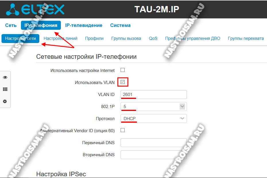 Примечание: В некоторых случаях для работы голосового шлюза Eltex TAU 2M.IP необходимо указать идентификатор виртуальной сети — VLAN ID. Этот момент необходимо заранее уточнить в техподдержке, а так же узнать номер этого идентификатора. После этого кликаем на значок шестерёнки в меню слева чтобы попасть в расширенные параметры Элтекса. Нам нужен раздел IP-телефония -> Настройки сети: