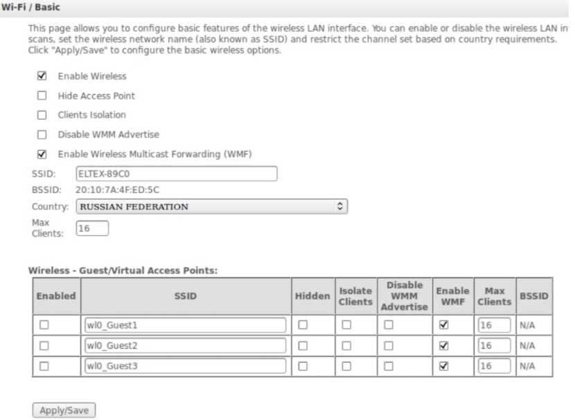 Теперь ниже в поле SSID – вводим название беспроводной сети. Обязательно указываем страну, в которой вы сейчас находитесь, это нужно для того, чтобы роутер грамотно выбрал используемые каналы. В строку «MAX Clients» можно выставить ограничение по подключаемым клиентам по беспроводной сети. Я настоятельно не рекомендую выставлять значение больше указанного. Применяем и сохраняем параметры.