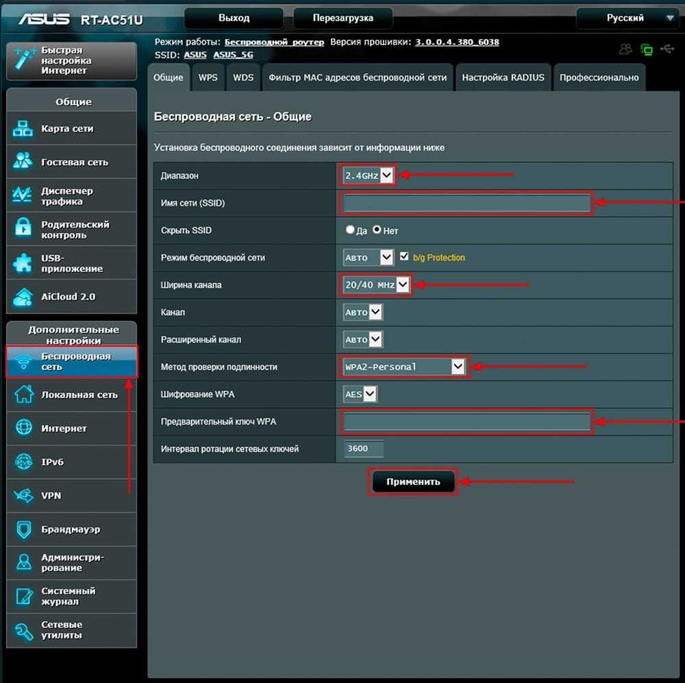 Установка параметров Wi-Fi-сети Asus RT-N12 проводится в разделе дополнительных настроек при выборе пункта «Беспроводная сеть» и вкладки «2.4G Общие». На ее странице сети присваивается имя («Билайн» N12), выбирается тип шифрования (AES) и способ проверки (WPA2-PSK) подлинности сообщений. Пароль для подключения к сети должен использовать не менее 8 символов. Для сохранения данных выполняется команда «Применить».
