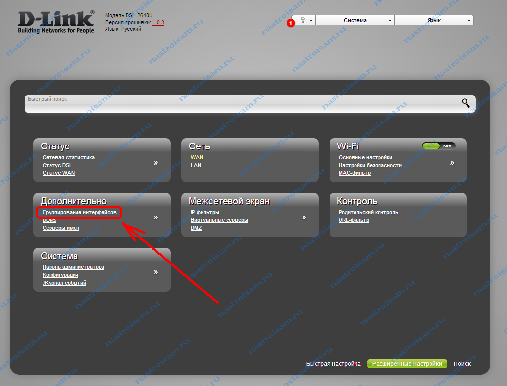 Затем заходим в раздел «Настройка интерфейса»->»Интернет»: