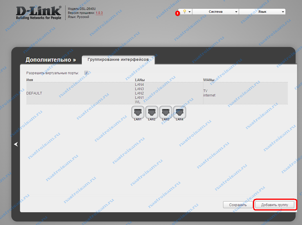 В поле Имя прописываем название группы — iptv , например. Ниже, с помощью стрелок, перемещаем один из LAN-портов из левого поля — в правое. То же самое и с WAN-соединением: соединение TV перемещаем вправо. Нажимаем кнопку Сохранить. В группировке интерфейсов получаем две группы: