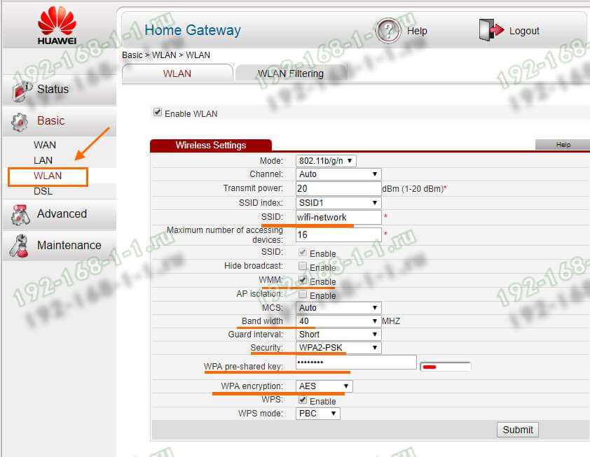 В интерфейсе модема Huawei HG532E, настройки WiFi собраны на страничке «WLAN»: