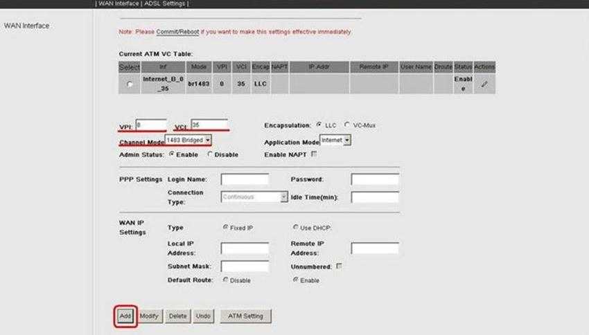 Галочку «IGMP» выставлять не надо, установите селектор «Encapsulation» в значение «LLC», включите NAPT. В завершение, нажмите «Add», а затем роутер перезагружают. Для этого, перейдите к вкладке «Admin» –> «Commit/Reboot» и нажмите кнопку «Reboot» (в ниспадающем списке должно быть значение «Save»).