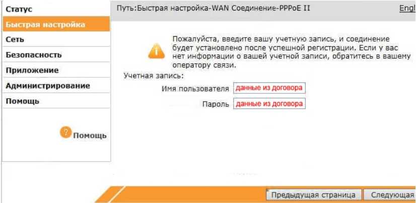 На следующей странице нужно ввести логин и пароль для подключения к Интернету, который Вам выдали при заключении договора: