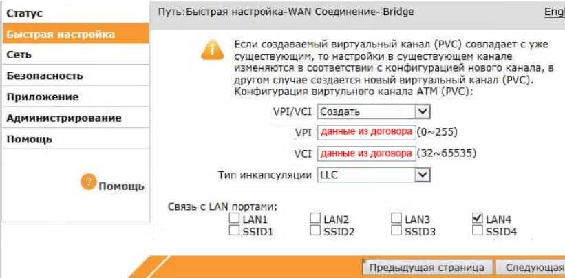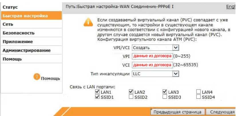 - С листа вводим данные «VPI» и «VCI». Теперь ниже указываем порты, которые будут использованы интернетом. Указываем все «LAN» кроме того, к которому будет подключена IPTV приставка. Если её нет, то указываем все порты. И ставим галочку напротив «SSID1».