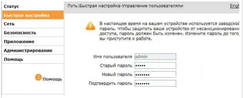 После авторизации, первое, что будет предложено — это смена пароля. Вводим старый и дважды повторяем новый пароль на вход: