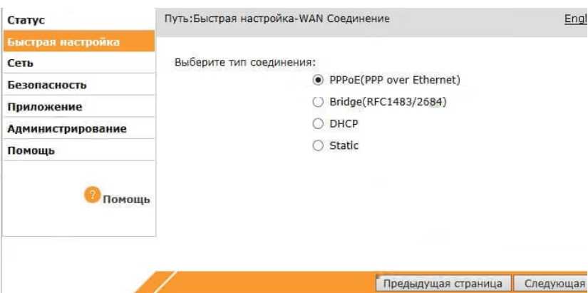 Теперь нужно снова авторизоваться и запустить Быструю настройку, где попадаем на этап выбора тип соединения с провайдером: