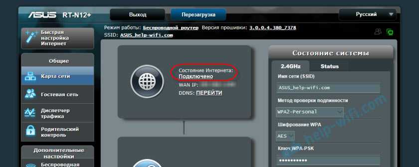 Если Asus RT-N12E не может подключится к интернету, то он будет раздавать Wi-Fi сеть без доступа к интернету. Я уже писал об этой проблеме: роутер Asus не раздает интернет по Wi-Fi сети. Проверьте все параметры в разделе «Интернет». Уточните настройки у провайдера. Возможно, ваш провайдер делает еще привязку по MAC-адресу. И нужно клонировать MAC-адрес, или прописать новый у провайдера.