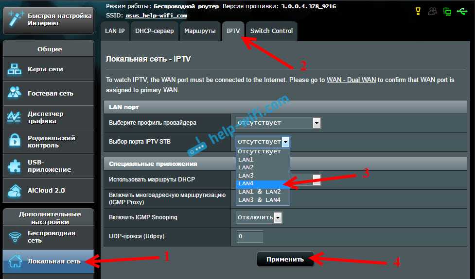 IPTV на Asus RT-N12E можно настроить в разделе «Локальная сеть» – «IPTV». Подробнее в статье: настройка IPTV на роутере ASUS по Wi-Fi, кабелю и через приставку.