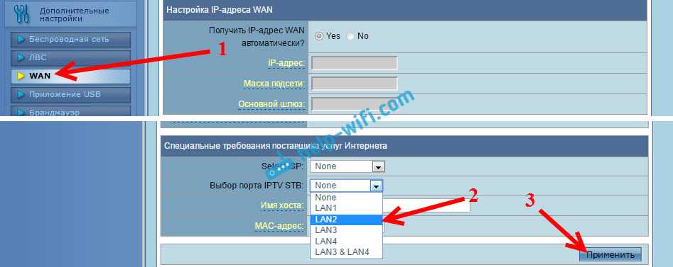 Если у вас роутер с более старой, голубой прошивкой, то в панели управления откройте вкладку WAN, и в меню «Выбор порта IPTV STB» укажите нужный порт. Нажмите на кнопку Применить.