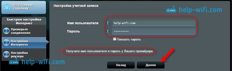 Дальше, понадобится указать имя пользователя и пароль для подключения к провайдеру. Эту информацию выдает провайдер. Она так же может быть указан в договоре о подключении к интернету.