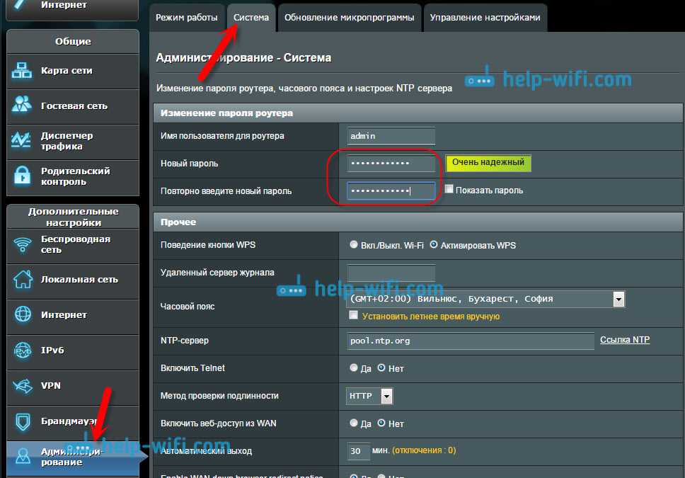 В процессе настройки, мы уже задавали новый пароль для доступа к панели управления. Но, если вы этого не сделали, или хотите сменить пароль, то перейдите на вкладку Администрирование — Система. Укажите два раза одинаковый пароль, и нажмите кнопку Применить.