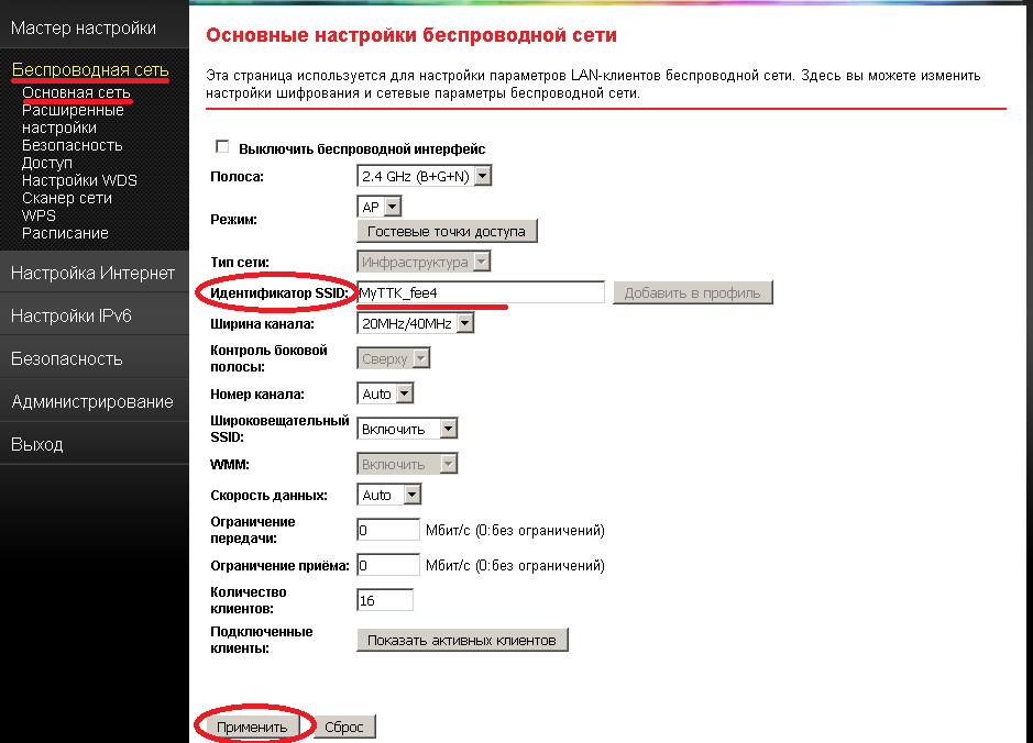7. Настройка беспроводной сети. Для настройки Wi-Fi переходим в раздел Беспроводная сеть – Основная сеть. Настройка беспроводной сети. Заполните поле: Идентификатор SSID: Название вашей Wifi сети (придумайте самостоятельно). Нажимаем кнопку Применить.