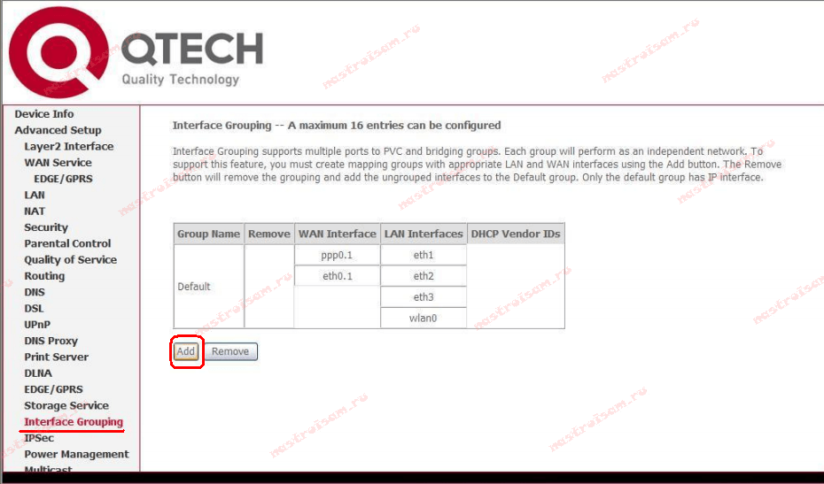 Перейдите в меню Advanced Setup –> Interface Grouping и нажмите кнопку Add, как показано на рисунке ниже.