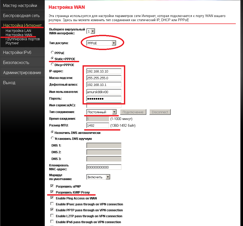 6. Создание подключения PPPoE. Откройте пункт меню Настройка Интернет далее Настройка WAN. Выбираем тип доступа «PPPoE», ставим переключатель на Static+PPPOE. Заполняем поля IP-адрес: 192.168.10.10, маска подсети: 255.255.255.0 , дефолтный шлюз: 192.168.10.1. Далее из договора берем учетные данные: имя пользователя, пароль. Остальные параметры должны быть такими как на картинке.