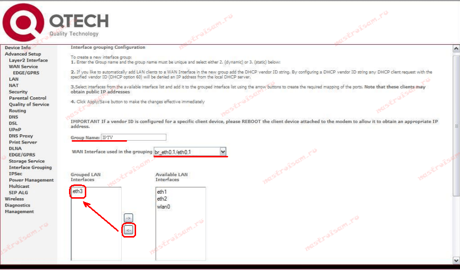 Если у Вас подключено Интерактивное ТВ от Ростелеком, то практически всегда для этого необходимо дополнительно запараллелить один из локальных LAN-портов QBR-1041WU с внешним ; WAN. Для этого в меню слева открываем раздел Группировка портов;: