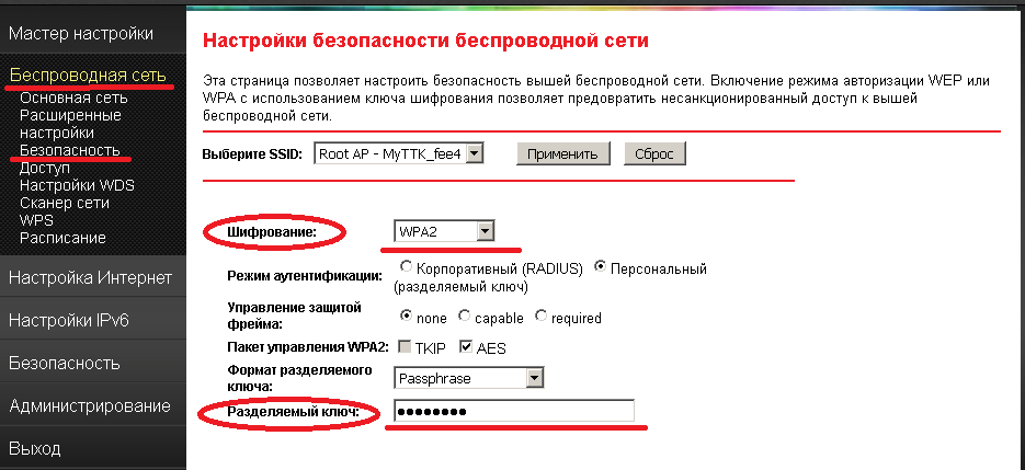 В списке «Выбор SSID» выбираем свою сеть. Ниже, в списке шифрования ставим стандарт WPA2 с режимом «Персональный». Пакет шифрования обязательно ставьте «AES». Теперь нужно придумать и ввести пароль на доступ к сети Вай-Фай в поле «Разделяемы ключ (PSK)». В его роли может выступать любая буквенная, цифирная или смешанная последовательность символов не короче 8 знаков. Кликаем на кнопку «Применить».