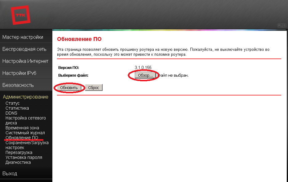 4. Обновление прошивки роутера. В главном меню роутера, выбираем пункт меню Администрирование, далее Обновление ПО.