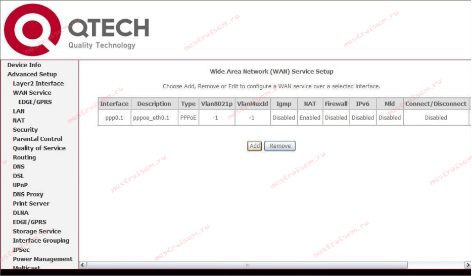Перейдите в меню Advanced Setup –> WAN Service, где необходимо нажать кнопку Add