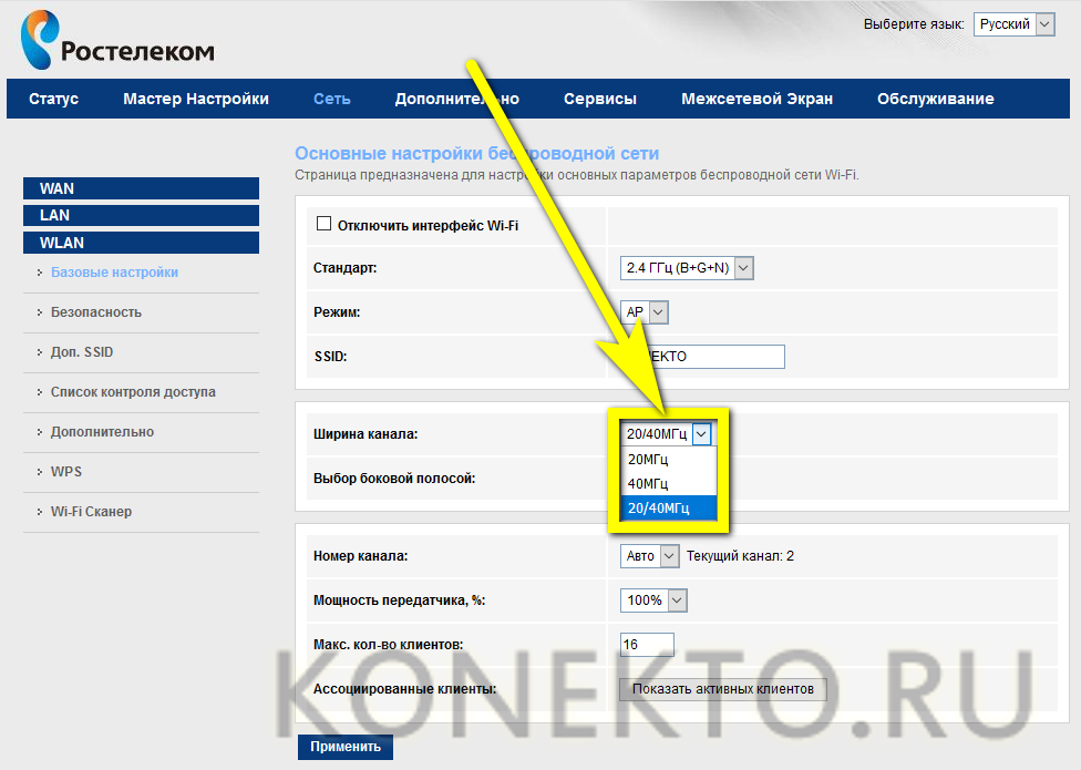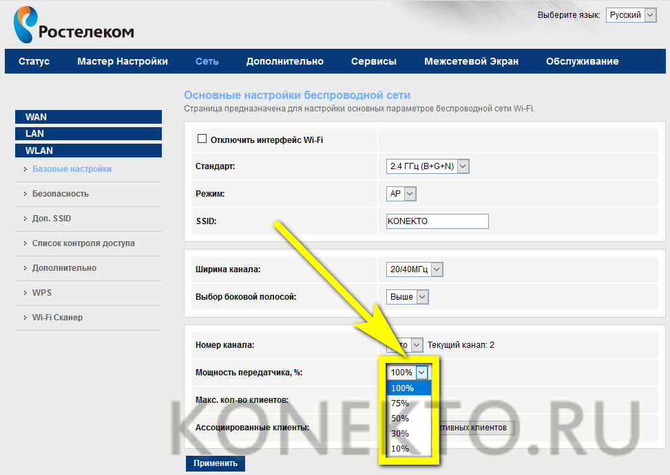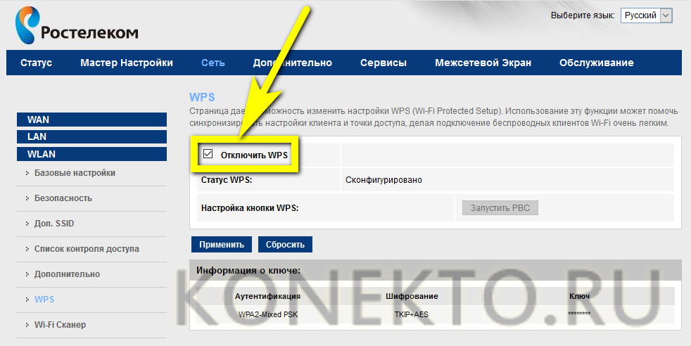 На вкладке WLAN «WPS» — определить, должен ли роутер Ростелекома поддерживать прямое сопряжение с мобильными устройствами.